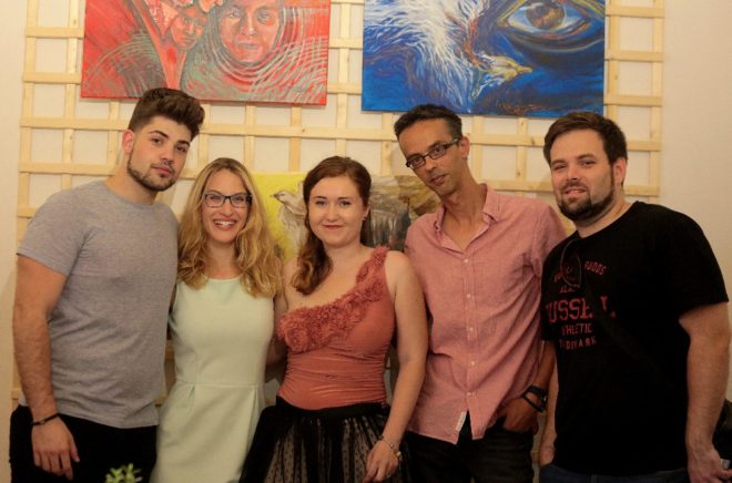 Uprostřed autorka EVA TOULOVÁ po její pravici (vlevo) herečka Marie Renčová a po její levici (vpravo) kurátor výstavy Lumír Žemla a zcela vlevo (po pravici herečky Renčové) herec Robert Cejnar