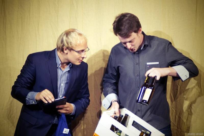 Pan Čihák (vpravo) předává ze sponzorské restaurace U Čiháků dar divadelnímu souboru – vlevo skvělý moderátor festivalu Martin Kočí.