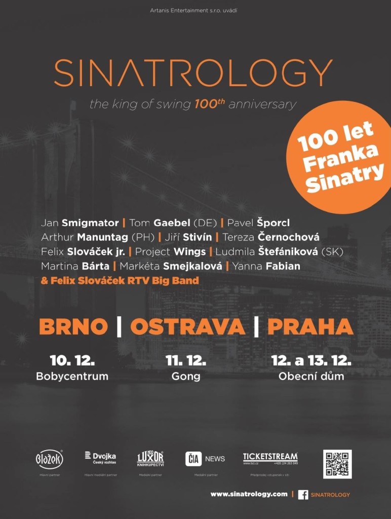 Král swingu Frank Sinatra by na konci letošního roku oslavil jubilejní 100. narozeniny. Oslavy na počest hudební legendy se odehrají po celém světě a Česko nebude výjimkou. Koncertní turné s názvem Sinatrology vyvrcholí 12. prosince v Praze přesně v den narozenin velkého šéfa. Špičkový český i mezinárodní swing si v prosinci užijí i moravské metropole. Pro velký zájem o vstupenky pořadatelé přidali koncerty 10. 12. v brněnském Bobycentru a 11. 12. v ostravském Gongu.