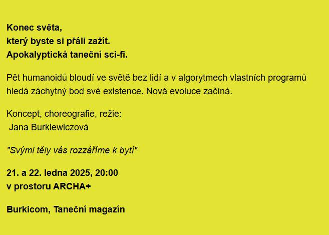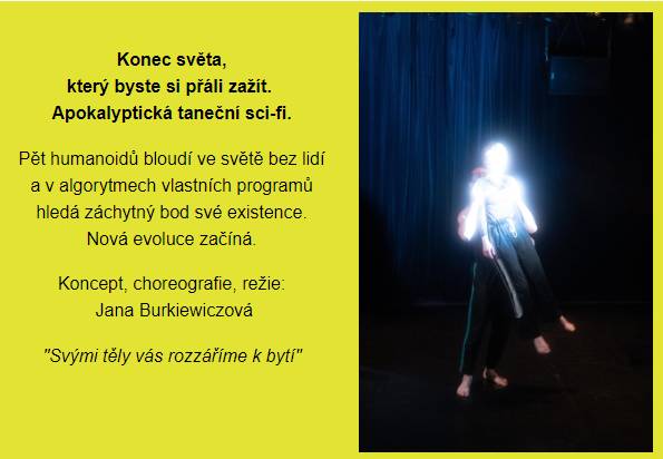 Soubor současného fyzického divadla Burkicom uvede 15. 10. od 19.00 a 16. 10. od 18.00 svou novinku Slunce, která je apokalyptickou sci-fi o lidskosti, obrazem konce, který si přejeme zažít. Pět humanoidů bloudí ve světě bez lidí a v algoritmech vlastních programů hledá záchytný bod své existence. Nová evoluce začíná!