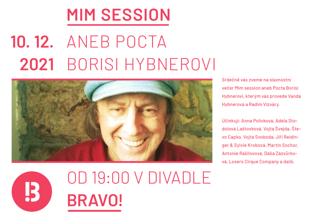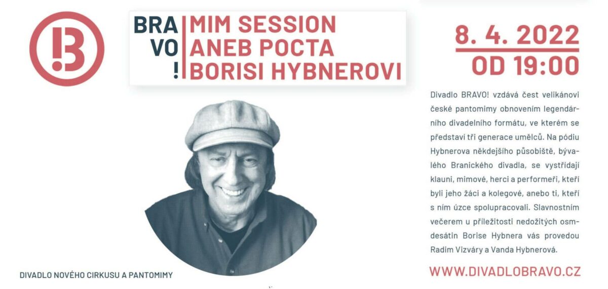 Český mim a herec Boris Hybner byl v 80. letech neodmyslitelně spjatý s Branickým divadlem. Pořádal zde Mim Session, divácky oblíbené komponované večery, během kterých oslovení umělci vystupovali na zadané téma. V minulém roce by Boris Hybner oslavil osmdesátiny. Dcera umělce Vanda Hybnerová a český mim a performer Radim Vizváry toto výroční připomenou návratem legendární Mim Session na pódium divadla v Braníku, které dnes funguje pod novým vedením s názvem Divadlo BRAVO!. Jedinečné představení se odehraje 8. dubna od 19 hodin.