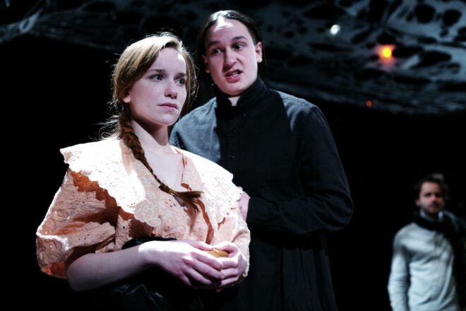 Režisérem inscenace Víra! Láska! Naděje? je Josef Kačmarčík. Hlavní role Helenky se ujala mladá herečka Terezu Vítů.  Alternuje ji Yvona Stolařová. Roli Jiřího si zahraje Matěj Vejdělek. Spolu s nimi ve hře účinkují Tomáš Novotný, Lucie Domesová, Libor Hruška a Jakub Kropáček.