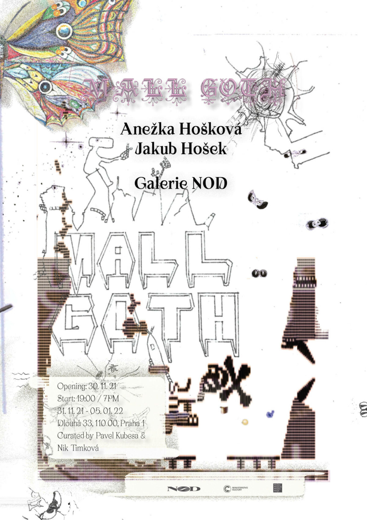 přijměte pozvání na vernisáž dlouho připravované výstavy MALL GOTH umělců Anežky Hoškové a Jakuba Hoška, která proběhne v úterý 30. 11. 2021 od 19:00 v Galerii NoD: