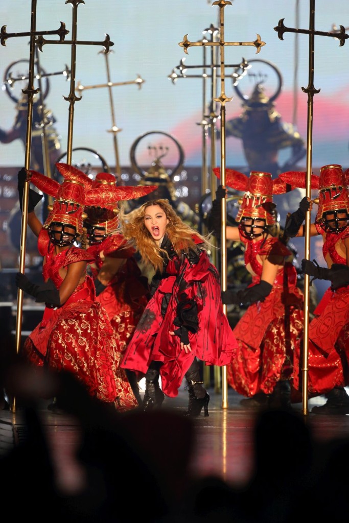 To všechno je Madonna, jak ji známe. I teď se během okamžiku obrovské svaté kříže mění v tyče pro pole dance tanečnice, které předvádí své výkony a Madonna také nestojí stranou.