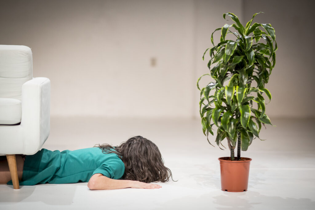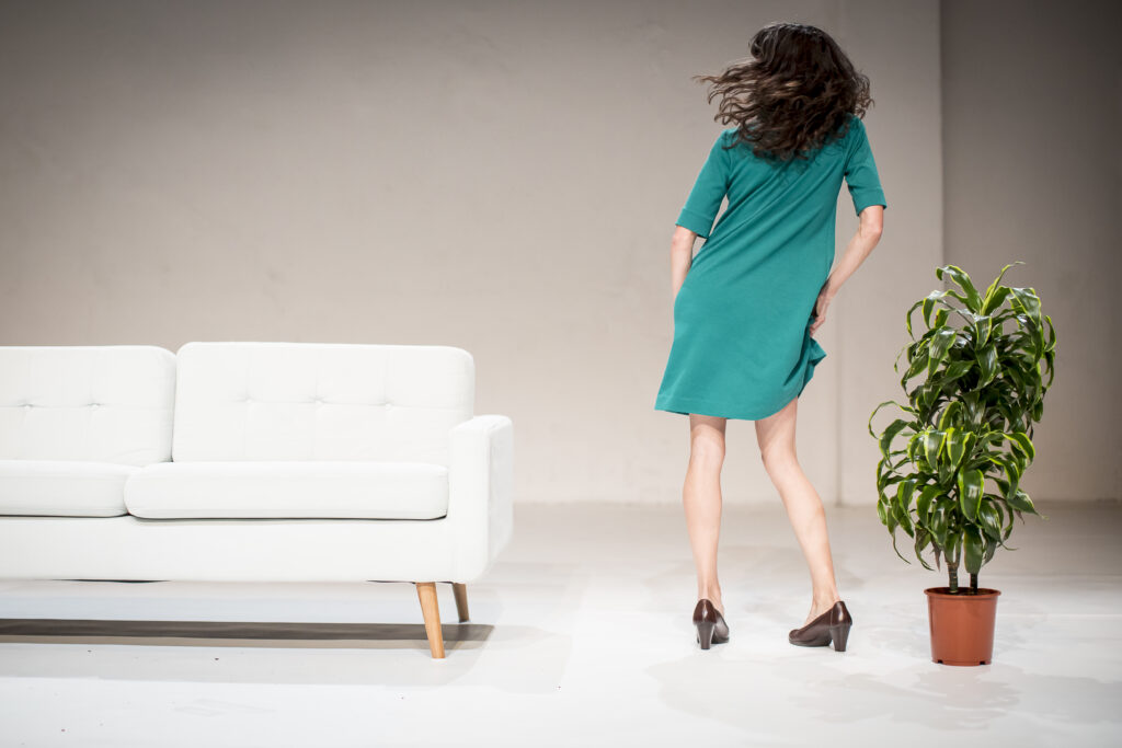 Cécile Da Costa si pohrává na osvíceném jevišti, kde se nachází pouze polstrovaná rozkládací sedačka s (pro mne) neidentifikovatelnou květinou fíkusovitého typu. Později jsem byl poučen, že se jedná o rostlinu jménem dracena. Ale zpět k hlavní představitelce. Povídá si, jak již bylo řečeno, sama se sebou i diváky. Monology jsou svébytné, spíše neposouvající děj. Někdy mírně filosofující, častěji spíše black-autové. Nakonec – můžete posoudit sami, zde mezi mými autorskými odstavci.