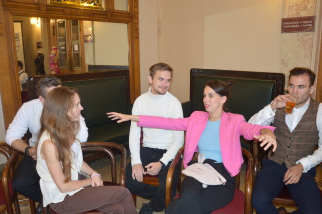 „To, že je mým partnerem Šimon, jsem se dozvěděla na první úvodní schůzce k Roztančenému divadlu. Nejprve Martin Šimek (autor) představuje celý projekt, vysvětluje vše podstatné a až následně se všichni dozvídají, s kým z té partičky vlastně tančí. ☺ Šimon je vždy pozitivně naladěný, takže i první seznámení bylo moc příjemné a na následném focení už mi připadalo, že se známe mnohem déle.“