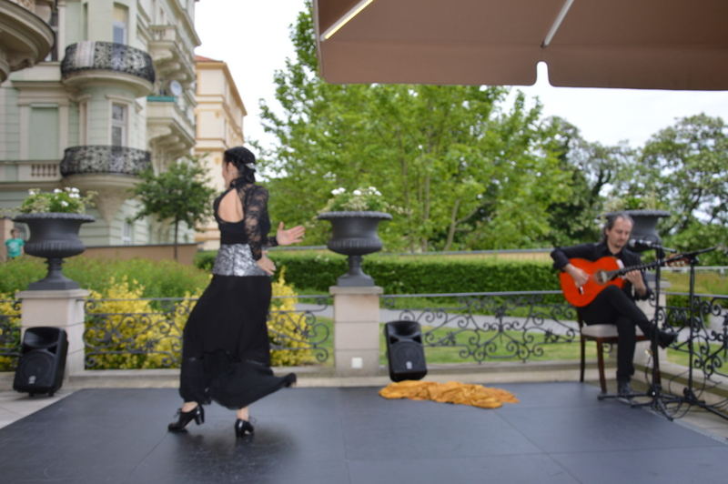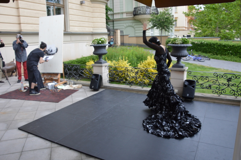 Emilio Fornieles při zahájení své vernisáže také představil „action painting“ – tvorbu portrétu před publikem během 60 minut, na vlastní námět speciálně určený pro Prahu, za doprovodu tanečnice flamenca Virginie Delgado a flamencového kytaristy Morenita de Triany.