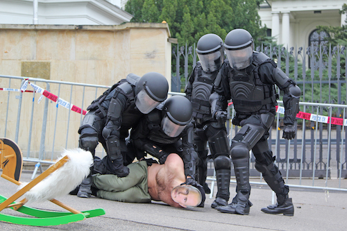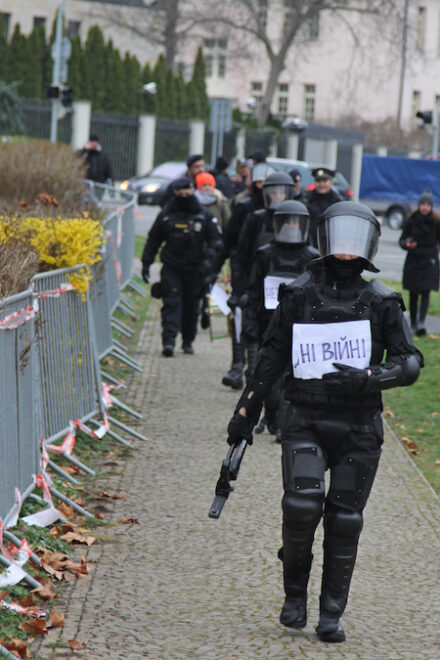 Mezinárodní kolektiv „Direct Action Theatre“ protestoval před ruským velvyslanectvím v Praze