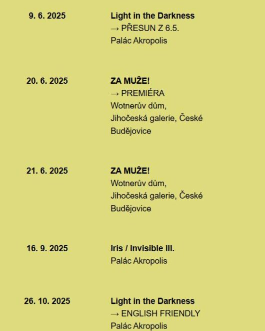 Máme velkou radost z toho, jak proběhla premiéra indoorové verze projektu Děti U, který se na podzim uskutečnil jako neopakovatelná performativní procházka mezi usedlostmi Prahy 5. Pod názvem Děti U: Fragmenty jsme přenesli do prostorů Paláce Akropolis jak jednotlivá díla upravená jako site-specific performance, tak i nové reflexe a ozvěny Dětí U v audio a vizuální podobě. Diváci se v intimní atmosféře potemnělého chill outu zaposlouchali do audio dokumentu Hodnota života ve chvílích nemoci a umírání Veroniky Štefanové a zhlédli filmovou meditaci Vladimíra Turnera s názvem Když promluvím, neslyším ticho. Děti U: Fragmenty jsou koncipovány jako imerzivní bloudění v podzemí divadla – v koncentrovanější a podle diváckých reakcí i intenzivnější podobě.