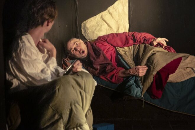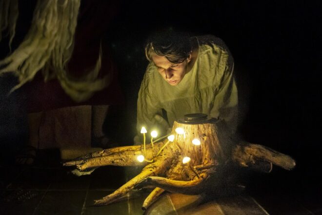 Učitel a Žák – dva archetypální lůzři, kteří na sebe zbyli. Jeden se ptá, druhý odpovídá; a opačně. Společně jdou až k lesu. Přichází únava. Je horko a nemají co pít, nikde žádný signál ani připojení, jen kdesi v dálce cíl, město, země, vesnice, která nutně potřebuje nového Mistra pro své žáky a Mistr zase potřebuje předávat své učení, aby se úplně nezapomnělo. Les je velký, hluboký a tajemný. A pak je tu Houba, ta na tabuli i živý organismus, v každém případě ale někdo „nasáklý“ – vodou, informacemi, mýty i rituály, zkrátka žádná tabula rasa. Může i tohle být škola? Může i tohle být zkouška?