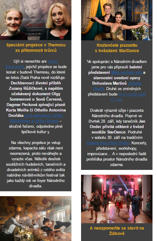 Stověžatá, magická, Zlatá. To třetí bude pro Prahu platit od 27. do 30. září, kdy se po čtyřiapadesáté uskuteční festival Zlatá Praha. Tentokrát se můžete těšit na skutečně pestrý program. Adam Plachetka, Štefan Margita, Petr Zuska, Soňa Červená nebo hvězdy StarDance. To jsou jen některé z osobností, které letošní ročník ozdobí.